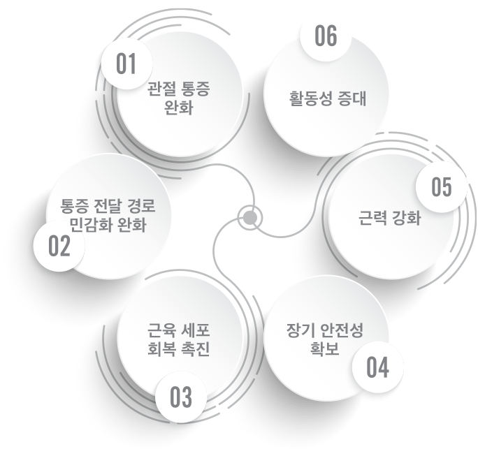 - 말초 통각 신경 민감화 완화: 근육 회복 (충격 흡수) → 관절 부하 및 반복적인 염증 감