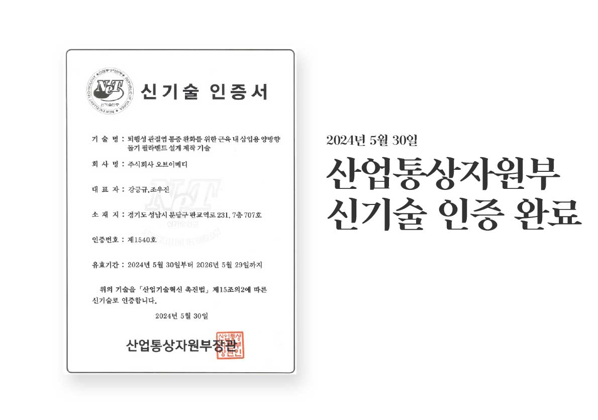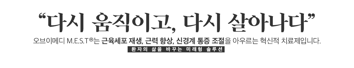 오브이메디의 MEST®(Muscle Enhancement Support Therapy) 퇴행성 관절염 치료제는 단순한 진통제가 아닙니다. 손상된 근육세포 재생과 근력 향상을 촉진하여, 환자가 스스로 움직일 수 있는 힘과 자유를 되찾게 합니다.
