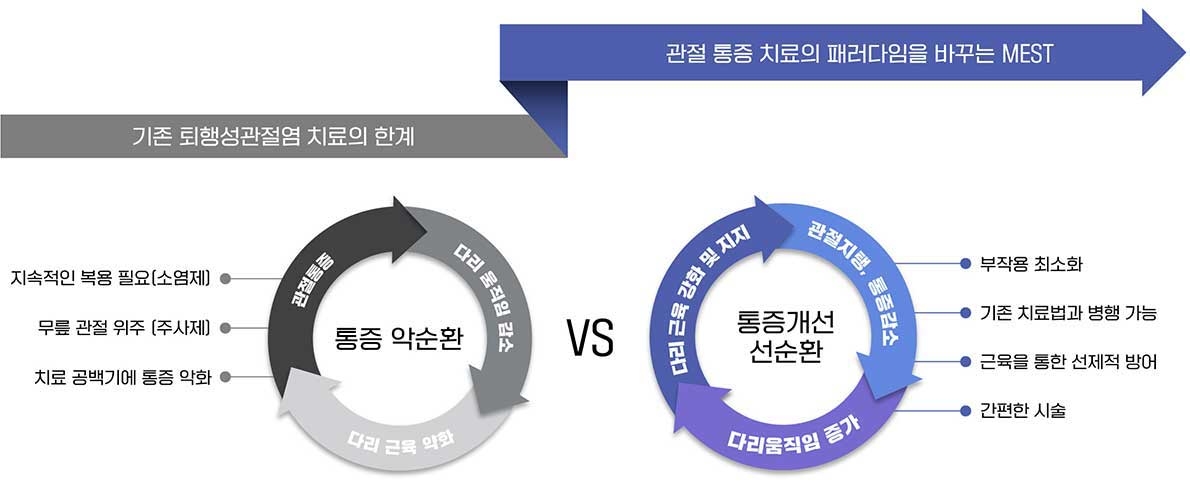 기존 치료제는 단순히 통증 억제에만 머물러 환자의 근본적인 기능 회복이 어려웠습니다. MEST®는 근육세포 재생 기반 치료와 신경계 통증조절을 통해 환자의 실질적인 운동 능력 향상을 가능하게 합니다.